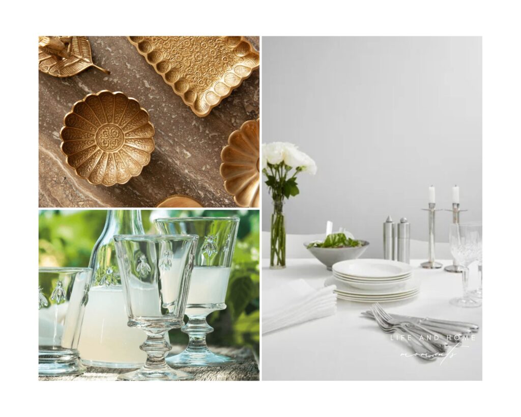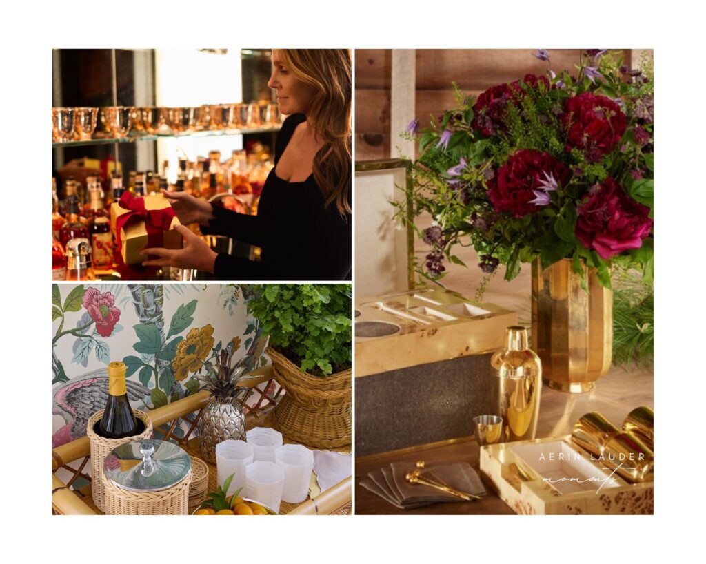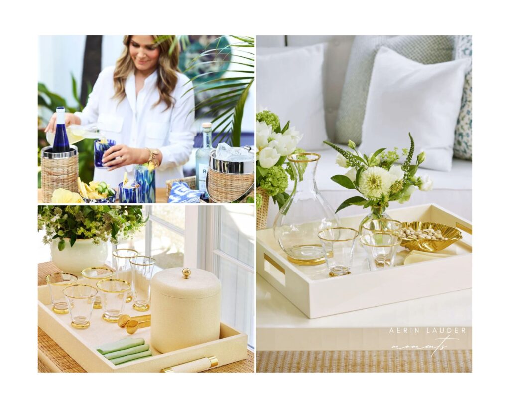 The Drinks Notes: If you are worried about guests not being able to mix a cocktail, then don’t be. Create some elegant drinks cards with simple drinks recipes they can follow. You can also consider featuring a signature cocktail that can be made ahead of time – an Old Fashion, Margarita or Negroni. When it comes to champagne, the host should always do the serving – not everyone is an expert when it comes to popping the cork. And do not forget the guests who prefer something non-alcoholic or light. For beautiful bar styling look to Aerin accessories to add a little touch of luxury to your evening.
