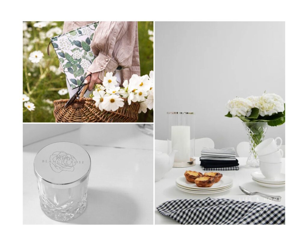 Welcome visitors into your home by displaying arrangements of fresh flowers. Flowers are the perfect accessory for any room or table, and the arrangements do not have to be large, or expensive. If you have seasonal blooms from your garden, these simply arranged in a beautiful vase can direct the table styling. Bringing the outdoors inside is a very easy step. And you do not have to be a florist. I tend to keep my flower colours simple and my go-to blooms for summer are white hydrangeas that are displayed in a simple glass vase.
