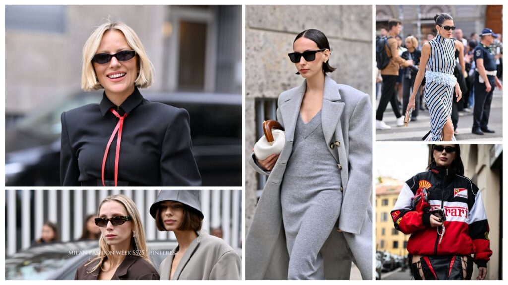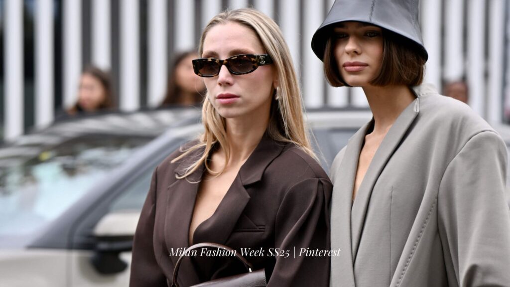 The fashion ensemble highlighted true Italian street style during Milan Fashion Week for Summer 2025. Perfectly painted lips, flowing rich hair and the perfect manicure were all on show. However, there were still the emerging of the spring summer ahead trend to be seen in makeup and hair moments. High ponytails, curtain bangs, brick red lipstick, blunt bobs, pastel nails, red hair, vampy lips, hair accessories and deep side parts.