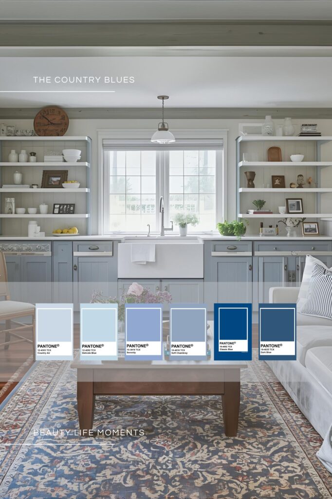 The country blues can create a space where country farmhouse sensibilities meet coastal calm. In a kitchen the inclusion of shaker-style cabinetry, ceramic accents, and open shelving bring a down-to-earth warmth, while the clean whites and airy layout keep things modern. By layering blues across cabinetry, textiles, and decorative details, the room invites relaxation without sacrificing style.