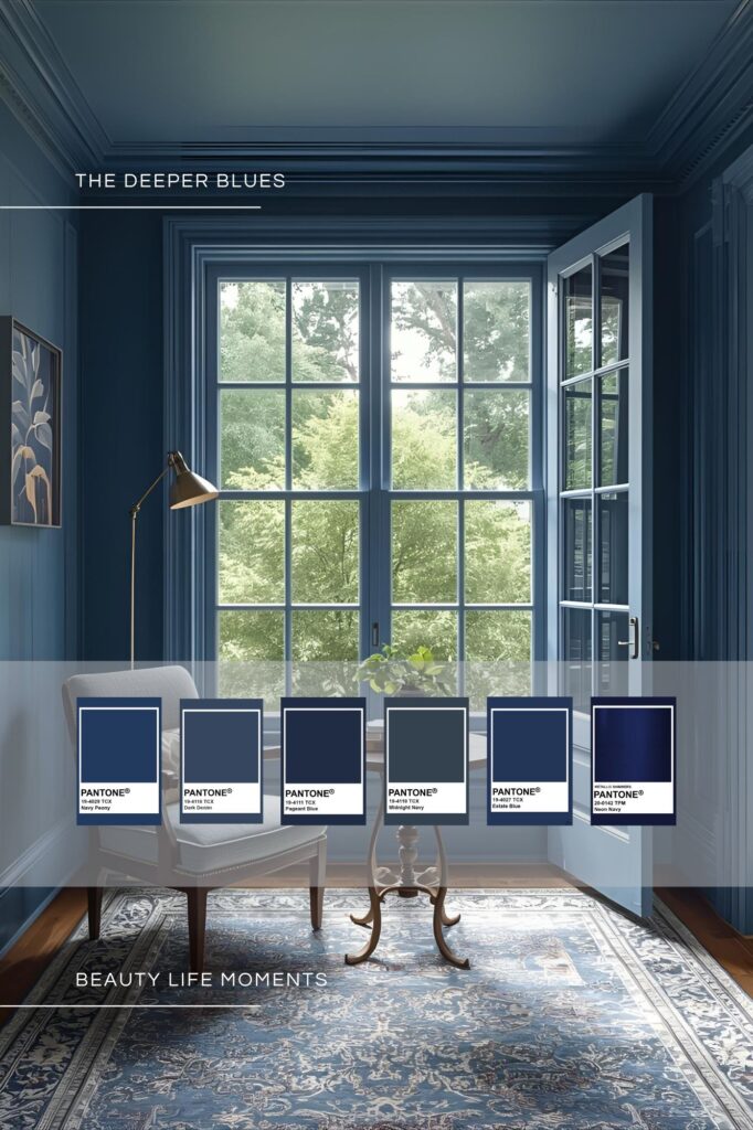 The deepest blues have a depth that holds an elegance and a quiet power. Rooted in richness, this palette draws from stormy seas, twilight shadows, and the timelessness of classic denim. These saturated tones exude confidence and sophistication—perfect for designs that demand presence without noise. Think: moody libraries, navy accent walls, velvet upholstery, and classic masculine refinement.