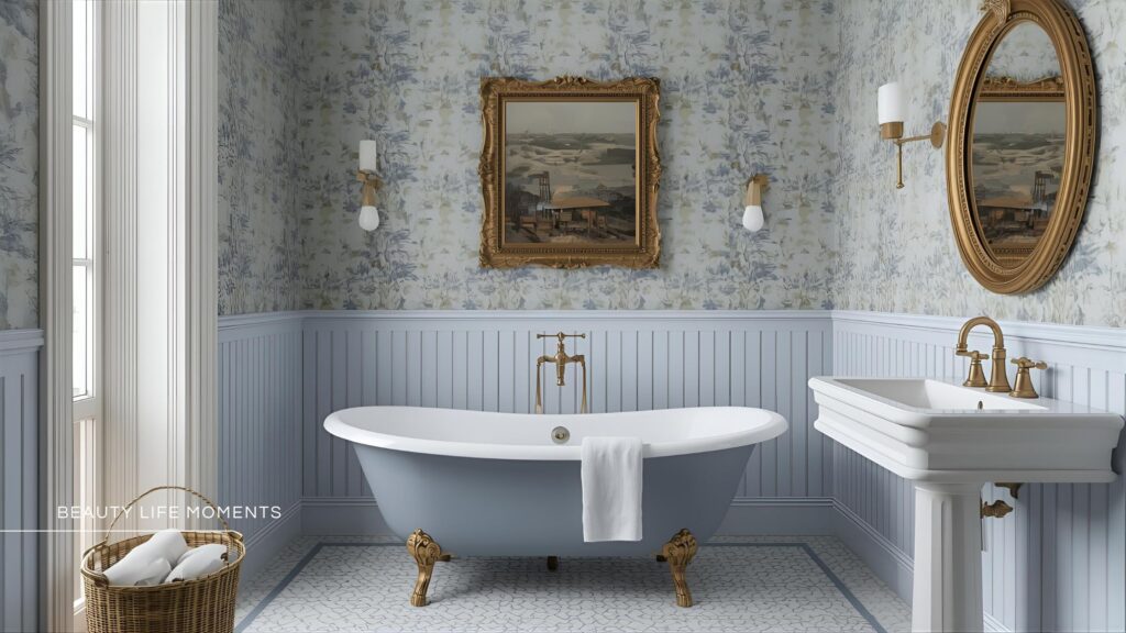 Despite its delicate nature, this palette has depth. The layering of florals, pale blues, and crisp white detailing results in a design that is both airy and intricate. The elegant brushed chrome hardware and the soft curvature of the mirror add polish and sophistication to a space that could otherwise feel overly traditional.